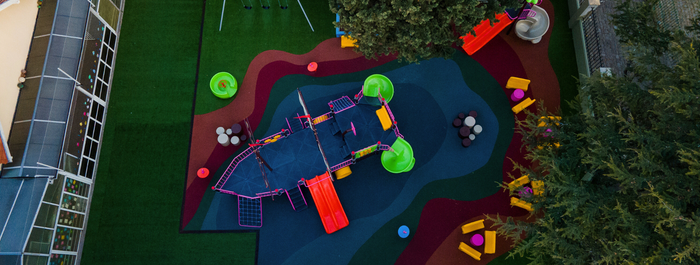 La temática seleccionada para este patio de juegos es "Jugando en la escuela", y se ha diseñado teniendo en cuenta diferentes actividades recreativas para diferentes edades.