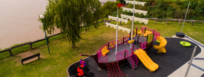 Una plaza temática con forma de barco pirata que invita a jugar, explorar y encontrar tesoros.
