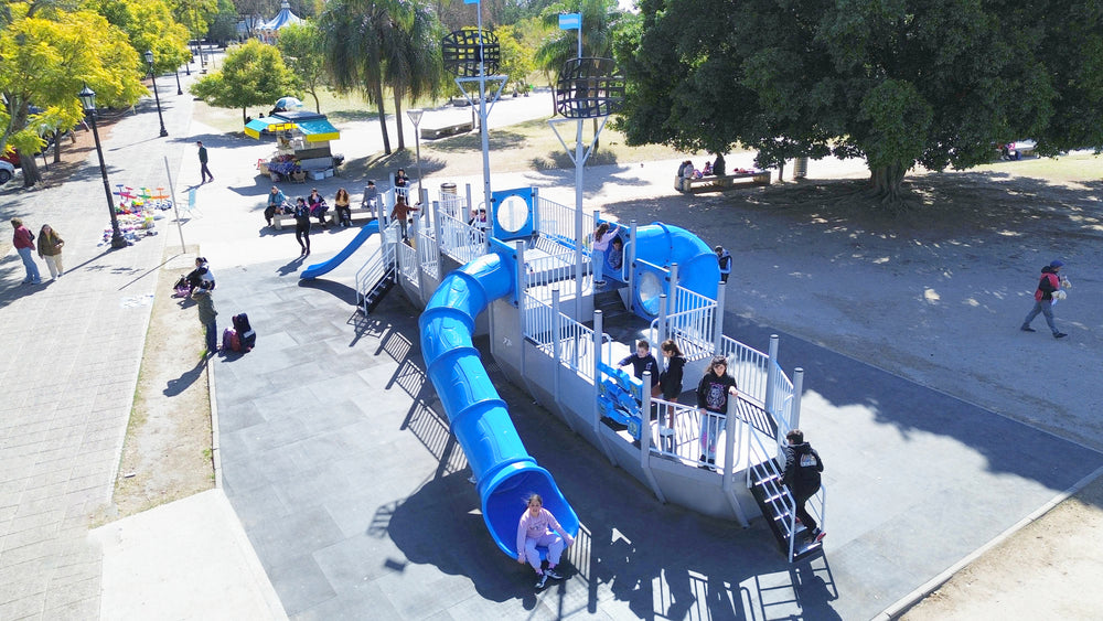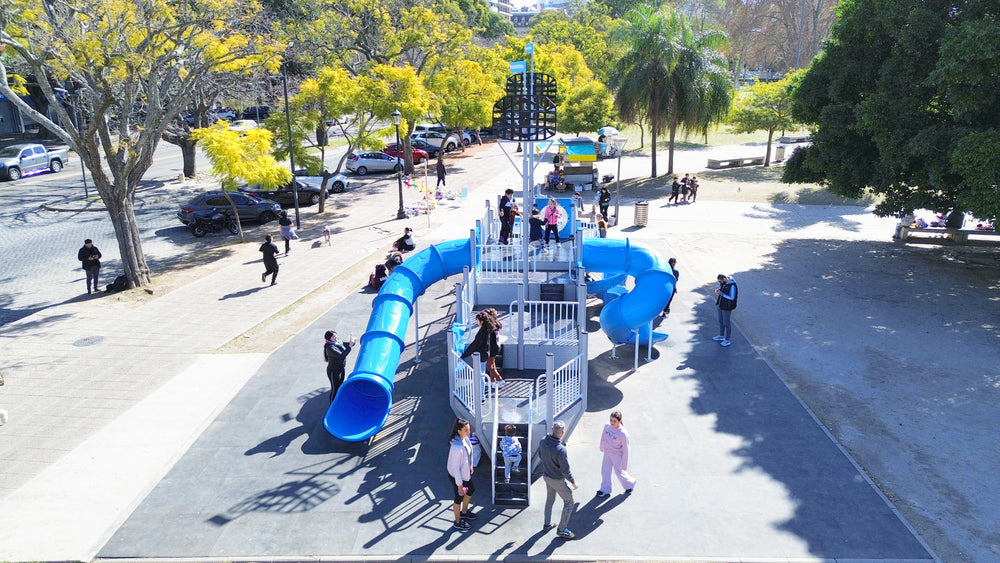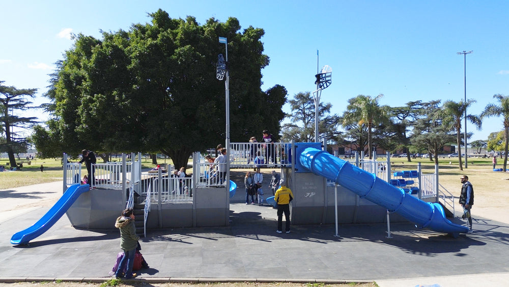 La estructura recrea la silueta y presencia del crucero, adaptada a una escala lúdica que invita a explorar, recorrer y jugar. El acceso al juego se realiza a través de palestras de red y escaleras, permitiendo múltiples formas de ascenso y fomentando el desafío físico. El recorrido se completa con distintas opciones de descenso, como pista de 0,9 m, tobogán rulo de 1,5 m y toboganes de 1,8 m, ofreciendo variedad y dinamismo.