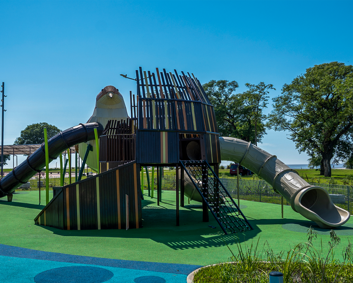 Este increíble parque de juegos es el destino perfecto para grandes y chicos ya que la naturaleza, la diversión y la aventura se conjugan a la perfección. El protagonista es un imponente mangrullo de madera en forma de hornero con una majestuosa estructura de 10 metros de altura que invita a los más aventureros a explorar. Con un tobogán circular que desciende desde el nido del ave, tomas de escalar y múltiples toboganes a distintas alturas, este mangrullo gigante promete adrenalina y entretenimiento sin límites.