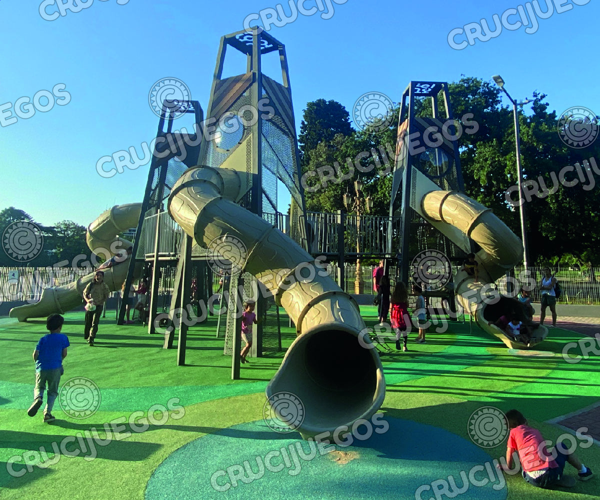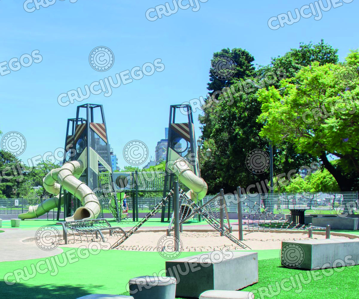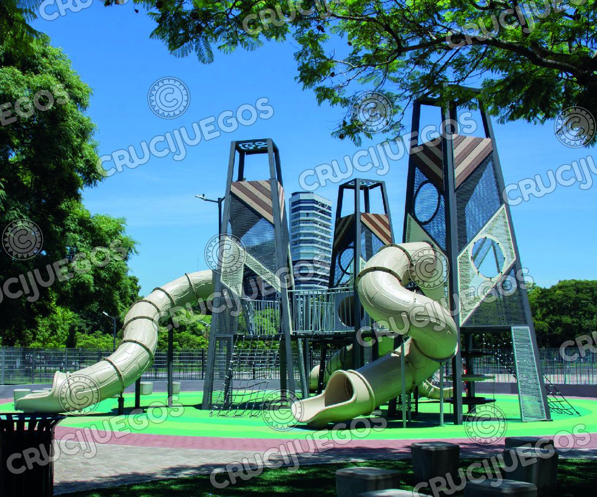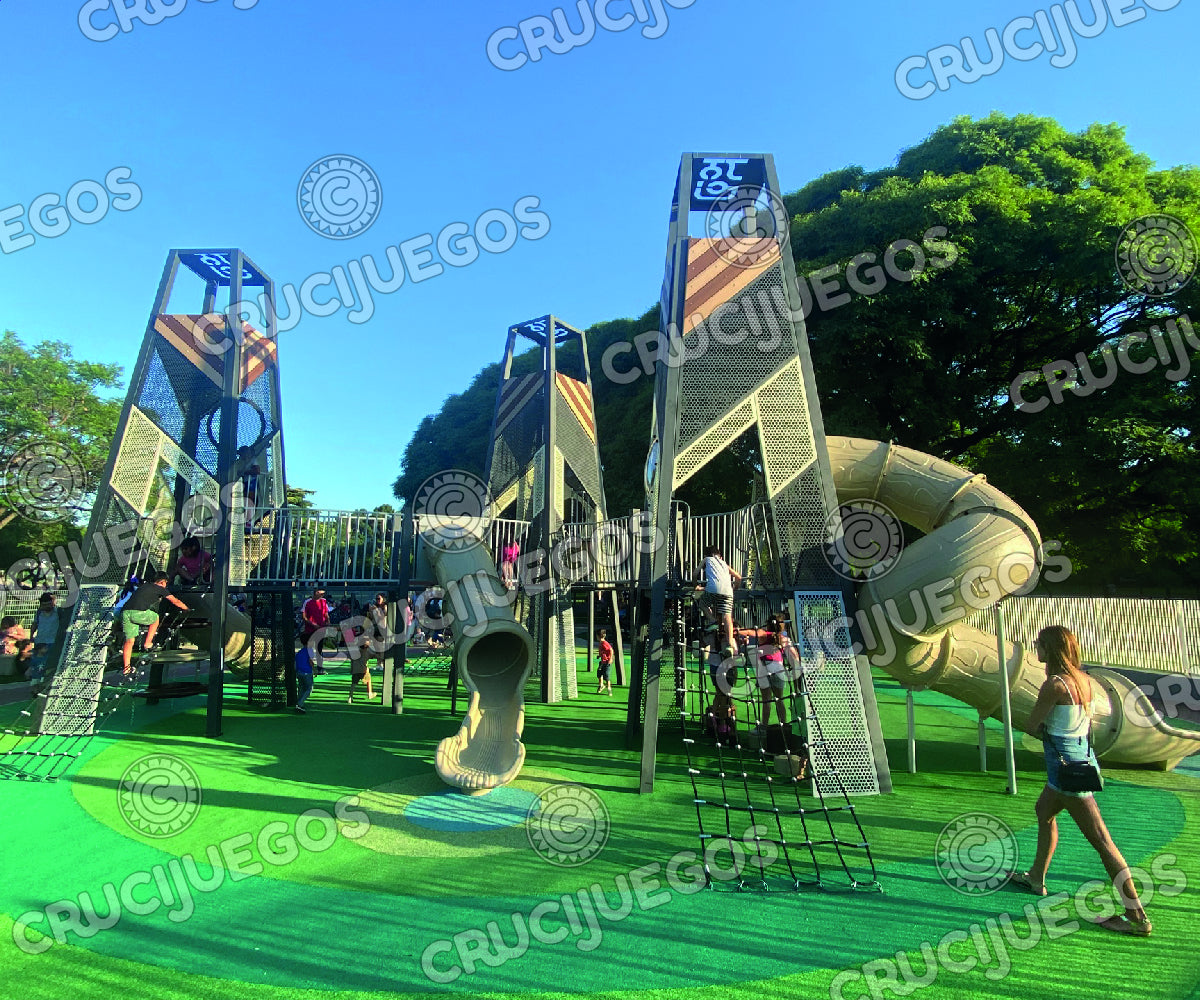 Son 3 torres de gran altura con forma de pirámide truncada equipadas con diferentes posibilidades lúdicas y toboganes para descender a tierra. Por medio de pasarelas que conectan las 3 torres se puede recorrer el juego en su totalidad. Cuenta además con redes para trepar y sogas de equilibrio en su primer nivel.