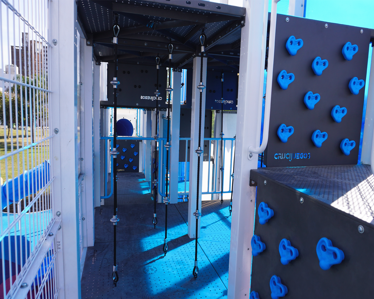 Con un imponente mangrullo en forma de cuadro este juego gigante convoca a desafiar los miedos y poner a prueba la destreza de los más pequeños pasando por 6 distintos niveles de altura con diferentes situaciones de juego: tomas de escalar, trepadores con sogas, rampas, tubos de gateo que conectan el juego entre sí y redes para trepar. La pared trasera está cubierta parcialmente por policarbonatos traslúcidos con los colores de la insignia patria que generan una interacción visual al proyectar la luz sobre los pisos y el entorno. En los extremos del piso superior se ubican dos toboganes cerrados de 3,5 mt de altura que descienden en zig-zag hasta la base.