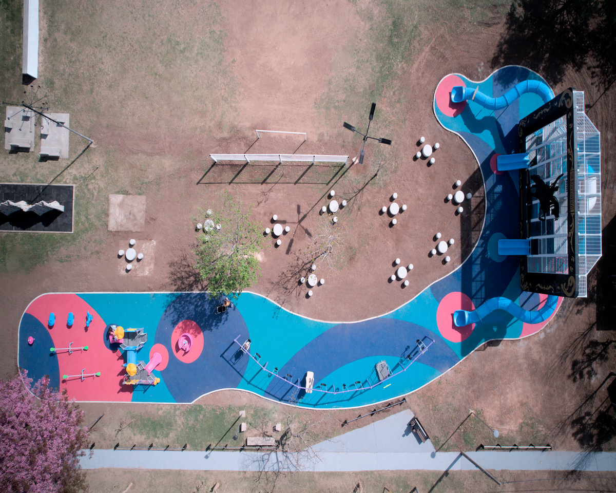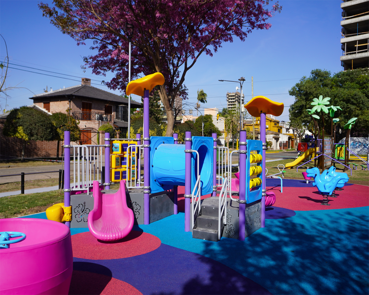 Además el patio dispone de un mangrullo Lilo primera infancia que cuenta con paneles Ta Te Ti de memoria, tambores, túnel de gateo y toboganes pequeños para poder deslizarse. Compuesta por calesitas, pórticos sextuple con una configuración diferente, spinners, dinos con resorte, sube y bajas esta plaza es ideal para jugar al aire libre y disfrutar del entorno. La plaza está cubierta por 438 m2 de suelo antigolpes de color rosa, celeste y violeta de Bongo y 10 conjunto de livings de hormigón de Vanka que hacen de este espacio un lugar único para disfrutar mientras los niños juegan.
